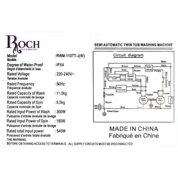 Machine à laver Semi-automatique Roch 11Kg