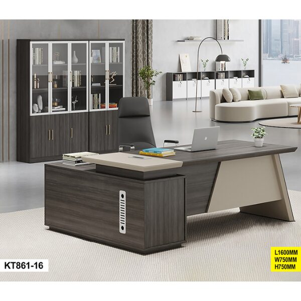 Le mobilier de bureau KT861-16 est une table de direction avec un retour latéral fixe. Il dispose d’une table dimensions de 160 cm (longueur) x 75 cm (profondeur) x 75 cm (hauteur). Il dispose également d’un plateau de table d’une longueur de 180 cm et d’une profondeur de 80 cm.Ce modèle offre donc à la fois un espace de travail spacieux et un retour latéral pratique pour le rangement ou la disposition d’équipements. Son design est souvent utilisé dans les bureaux de direction ou les espaces de travail nécessitant une grande surface de travail.