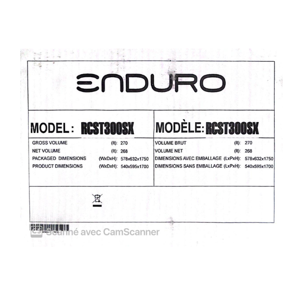 Réfrigérateur combiné Enduro RCST300SX – 270L – 3 tiroirs